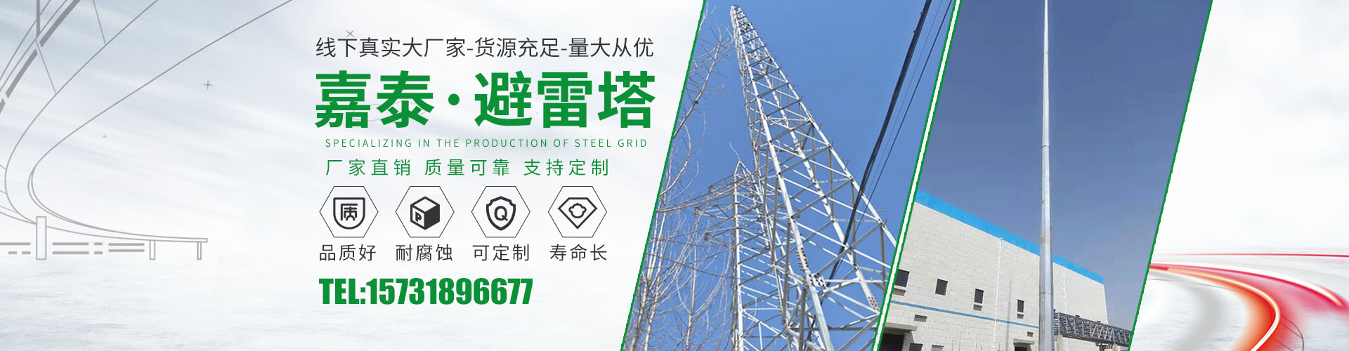 衡水嘉泰鋼結(jié)構(gòu)有限公司位于鐵塔制造之鄉(xiāng)-衡水市景縣廣川經(jīng)濟開發(fā)區(qū),石德、京九鐵路交匯處,距北京、天津、石家莊、濟南均在2小 時交通圈內(nèi),交通便利。公司主要產(chǎn)品有:避雷塔、監(jiān)控塔、瞭望塔、消防訓(xùn)練塔、電力架構(gòu)、樓頂工藝塔、廣播電視塔、煙囪塔、測風(fēng)塔 、電力塔、單管塔、雷達塔、仿生樹塔、氣象觀測塔、路燈桿,一體化基站、ETC龍門架等,是一家集設(shè)計,生產(chǎn),運輸,安裝,維護為一體的廠家。主要服務(wù)于鐵塔公司、通信三大運營商、國防通訊,鐵路及森 ......